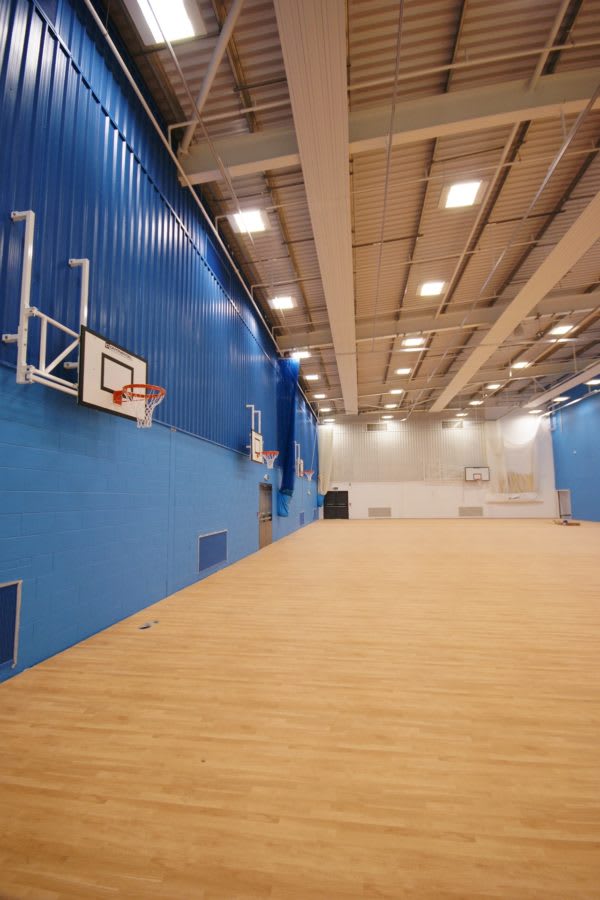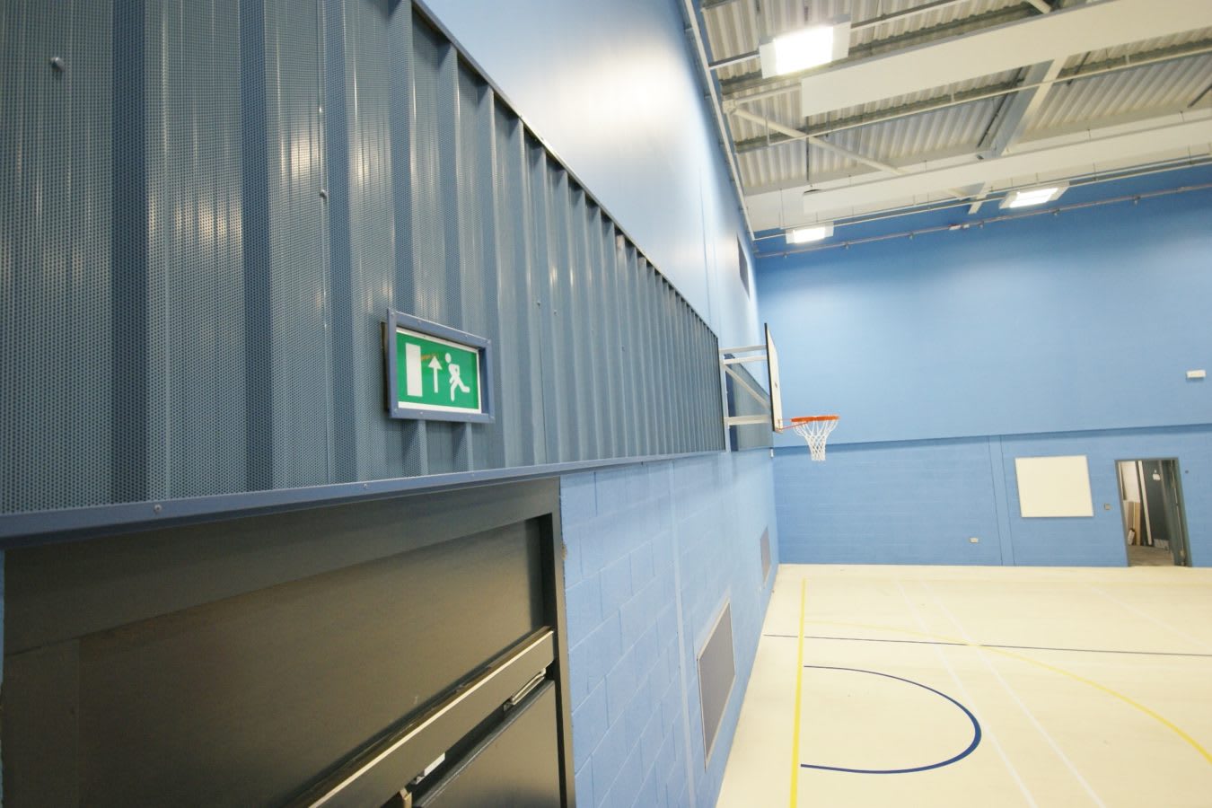 Sportsliner acoustic wall panel system used in the upgrade of a 1970s sports hall. The blue Sportsliner system was used to cover all the existing steelwork and damaged insulation. As well as providing a robust acoustic surface, the new Sportsliner finish incorporated additional thermal insulation so that the refurbished building meets modern standards.